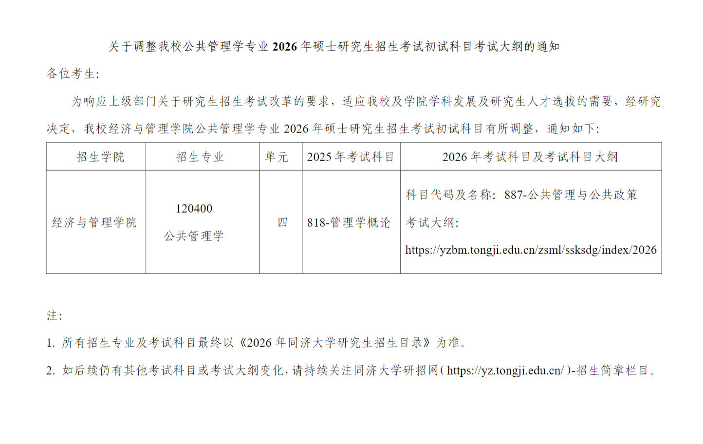 关于调整我校公共管理学专业2026年硕士研究生招生考试初试科目考试大纲的通知