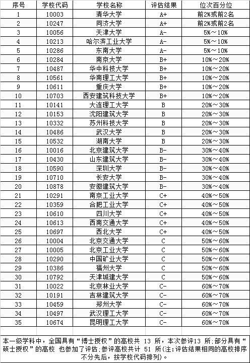 城乡规划学一级学科中,全国具有“博士授权”的高校共 13 所,本次参评13 所;部分具有“硕士授权”的高校 也参加了评估;参评高校共计 51 所(注:评估结果相同的高校排序不分先后,按学校代码排列)。