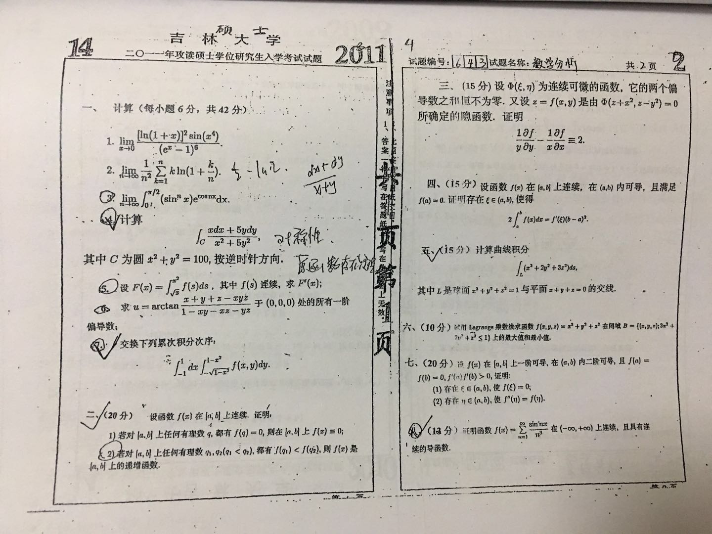 吉林大学 2011年 646数学分析真题