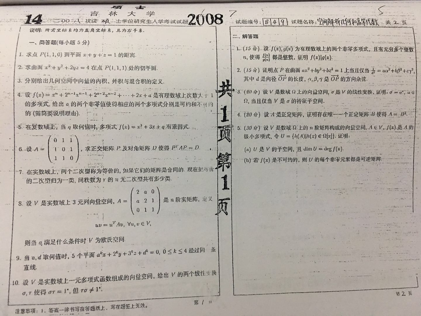 吉林大学 2008年 850空间解析几何与高等代数真题
