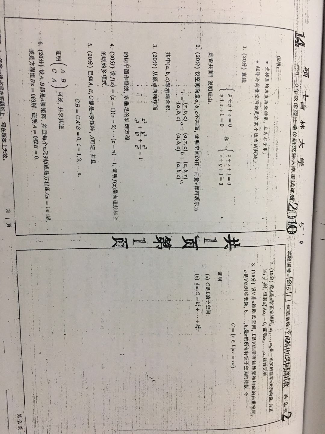 吉林大学 2010年 850空间解析几何与高等代数真题
