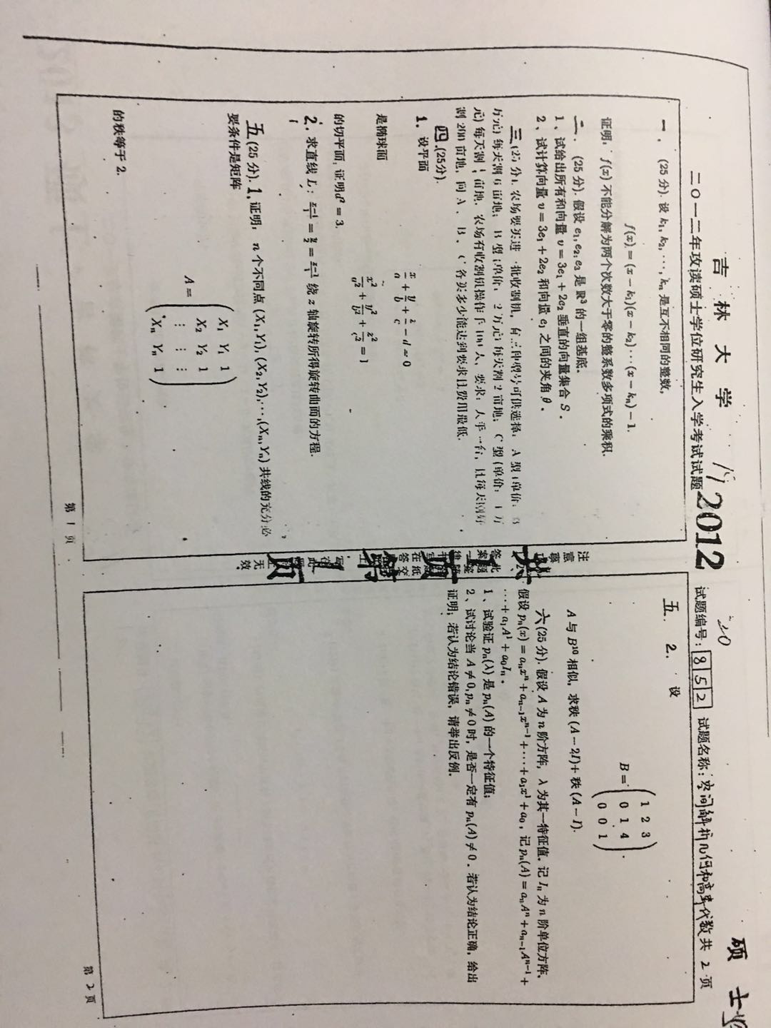 吉林大学 2012年 850空间解析几何与高等代数真题
