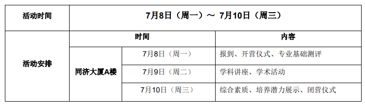 食宿:我院将为入选学员提供活动期间在沪食宿(注:学校或家庭所在地为上海的学员原则上不安排 住宿,特殊情况将酌情考虑),住宿安排:7 月 8 日~ 7 月 10 日(三晚)。