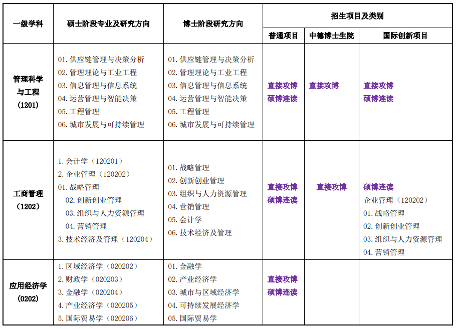 中德博士生院聚焦智能科技与绿色发展,围绕中德优势领域,开拓跨文化、跨学科、科教融合、产 教融合的新型人才培养模式,建立“人才培养-科学研究-国际交流”联动发展的世界一流学科国际化新机 制。本项目拟在工商管理、管理科学与工程专业招收直博生。