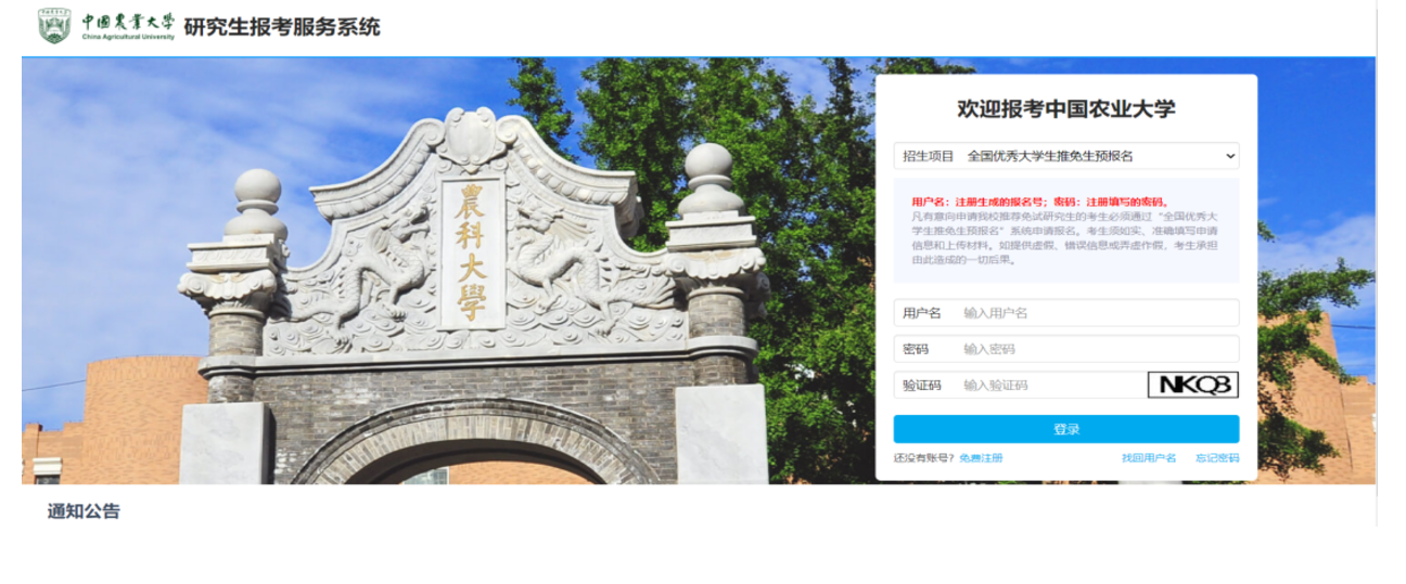 学校系统使用说明:考生登录网址:https://yzk.cau.edu.cn/;招生项目选择:中国农业大学接收推免生报名(请使用Windows系统、360浏览器,登录界面如下图);考生首次登录请选择“免费注册”,按要求完成注册即可登录报名。特别提示:每位考生只能注册一次。