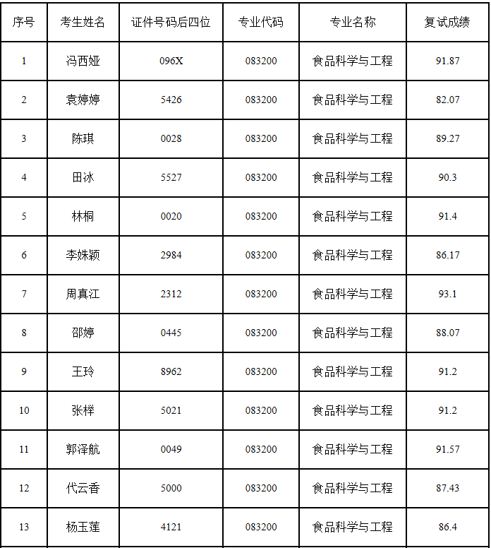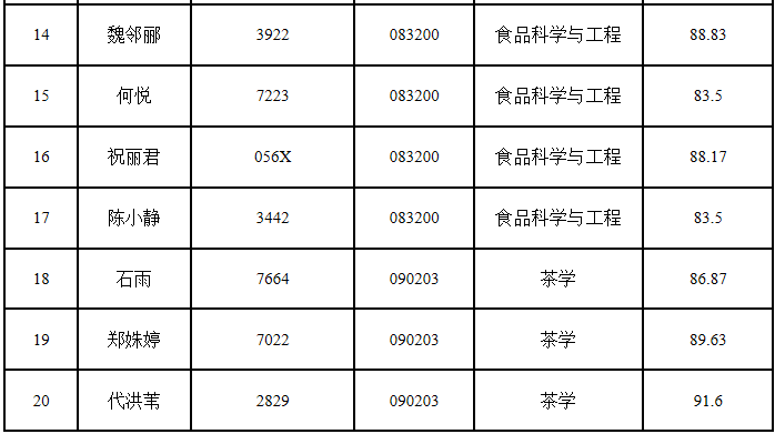 食品科学学院关于2020年接收推荐免试硕士研究生名单的公示