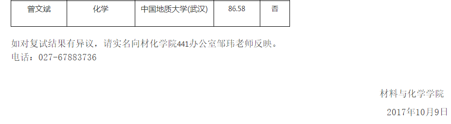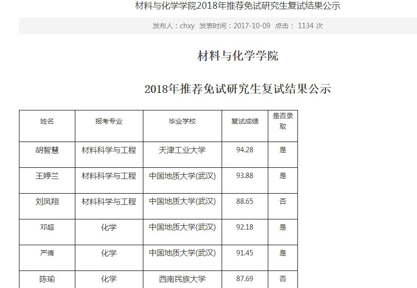 中国地质大学(武汉)材料与化学学院2018年推荐免试研究生复试结果公示