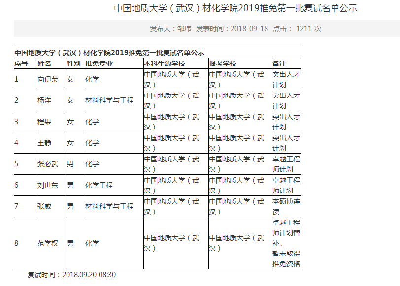 中国地质大学(武汉)材料与化学学院2019推免第一批复试名单公示