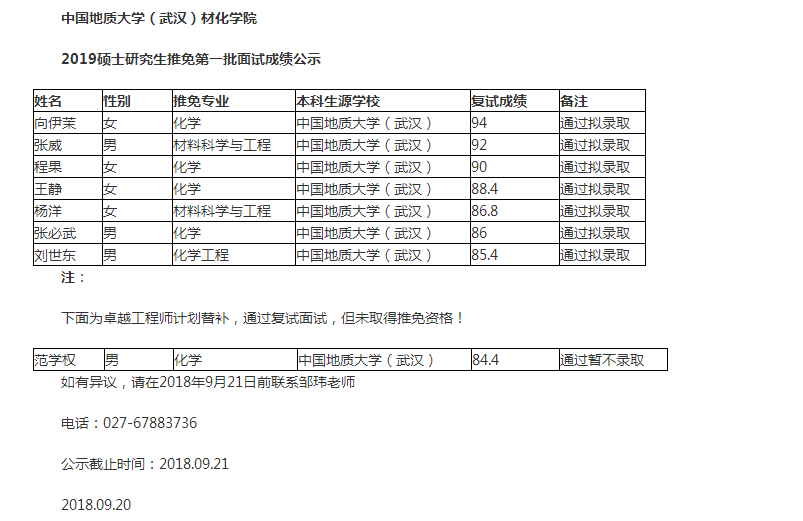 中国地质大学(武汉)材料与化学学院2019推免第一批面试成绩公示