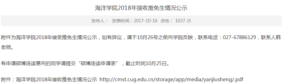 中国地质大学(武汉)海洋学院2018年接收推免生情况公示