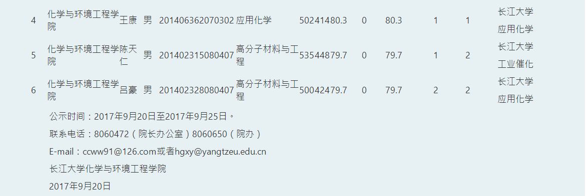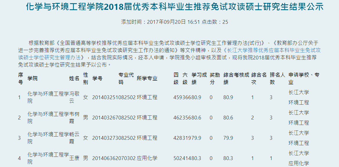 长江大学化学与环境工程学院2018届优秀本科毕业生推荐免试攻读硕士研究生结果公示