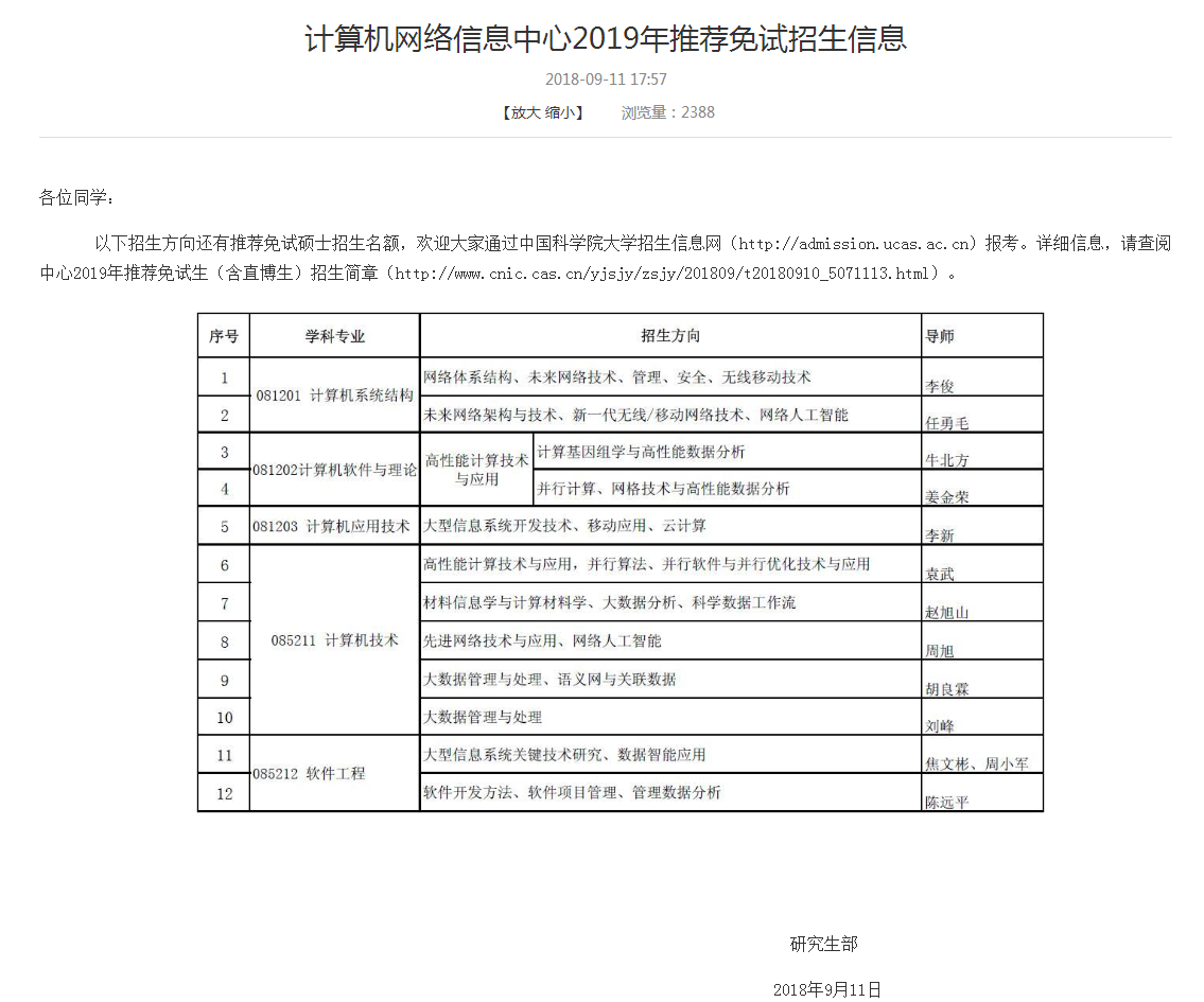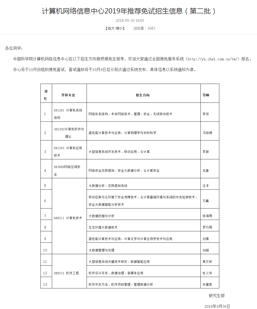 中国科学院大学计算机网络信息中心2019年推荐免试招生信息
