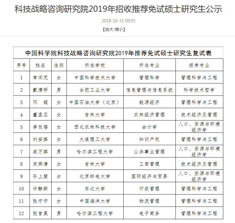 中国科学院大学科技战略咨询研究院2019年招收推荐免试硕士研究生公示