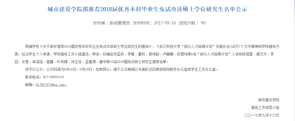 武汉科技大学城市建设学院拟推荐2018届优秀本科毕业生免试攻读硕士学位研究生名单公示