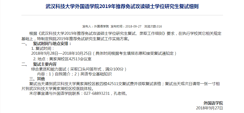 武汉科技大学外国语学院2019年推荐免试攻读硕士学位研究生复试细则