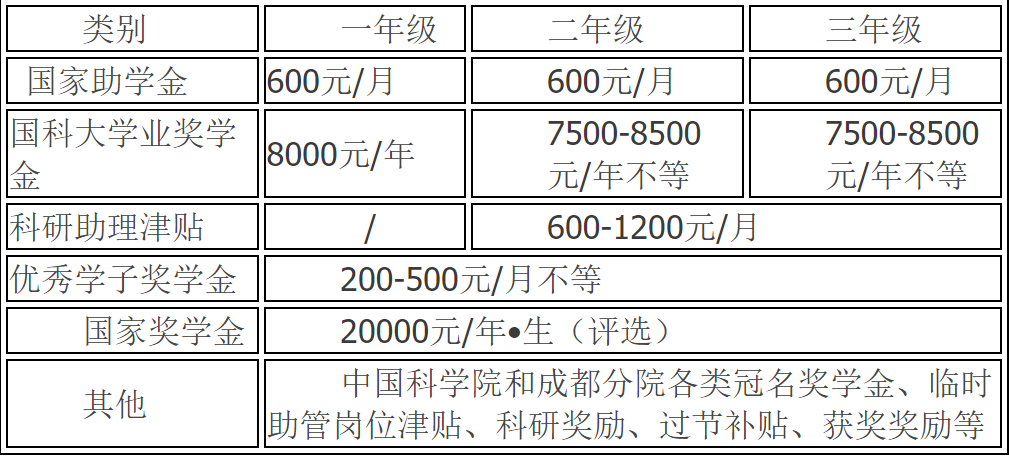 在学期间,本所为研究生提供了高额奖助体系。同时为在学研究生购买了成都市大学生普通医疗保险大学生医保基本医疗保险、大病医疗保险、大病互助补充保险、重特大疾病医疗保险和意外保险。除此之外,成都有机化学研究所在学硕士研究生还享受以下奖助学金待遇: