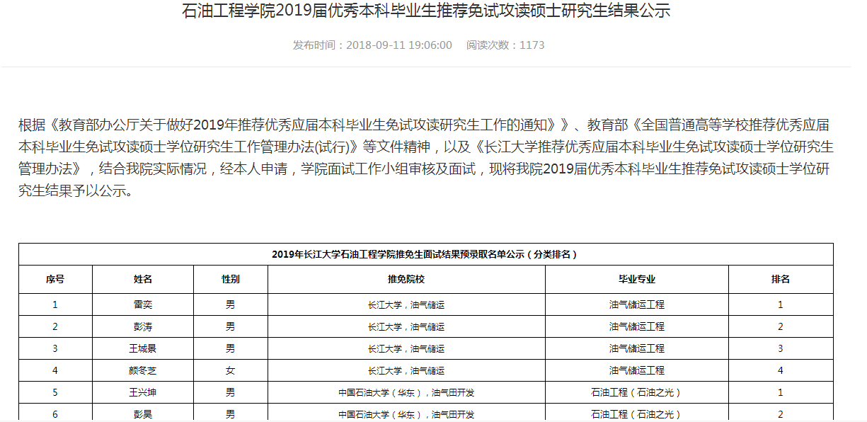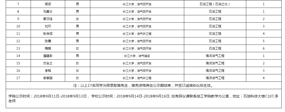 长江大学石油工程学院2019届优秀本科毕业生推荐免试攻读硕士研究生结果公示