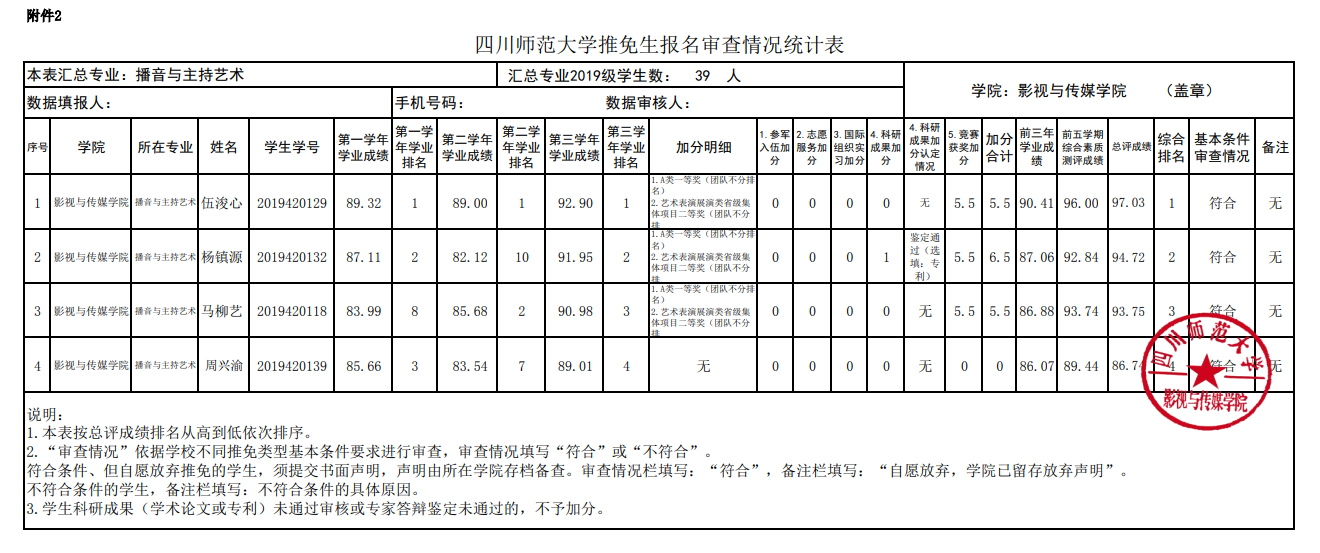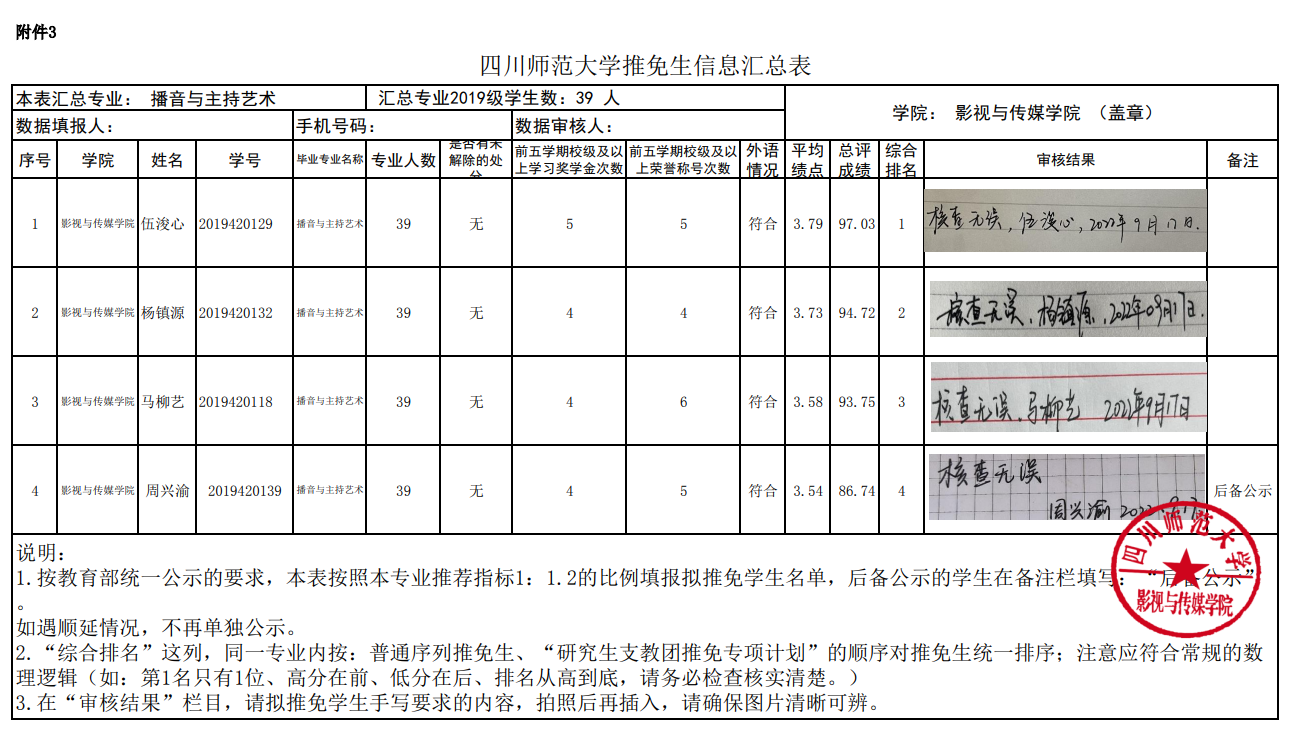 2.按教育部统一公示的要求,本公示按照本专业推荐指标1:1.2的比例公示拟推免学生名单,后备公示的须备注“后备公示”。如遇顺延情况,后备推荐的不再另行公示。
