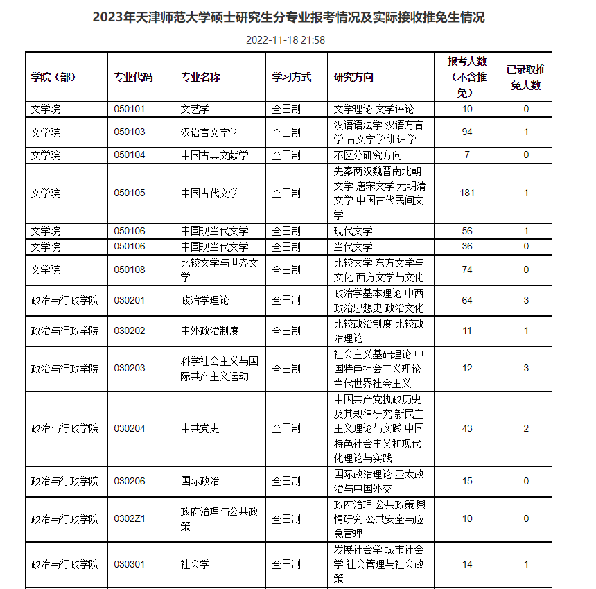 2023年天津师范大学硕士研究生分专业报考情况及实际接收推免生情况