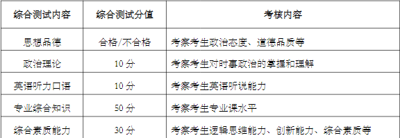 4.复试以面试形式进行,复试的综合测试成绩满分为100分,综合测试成绩不合格者(低于60分)不予录取。综合测试合格考生按招生专业,依据综合测试成绩从高分到低分顺序录取。若综合测试成绩相同,则按专业综合知识成绩排名录取。思想政治素质和品德考核为单独考察项,不合格者不予录取。