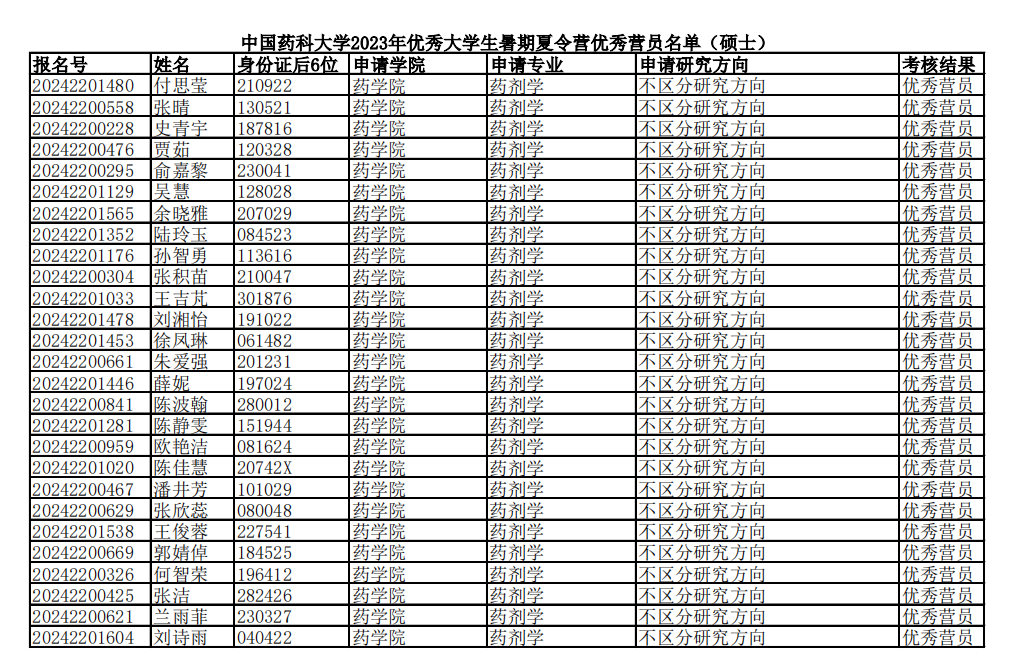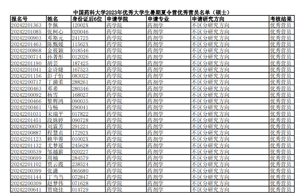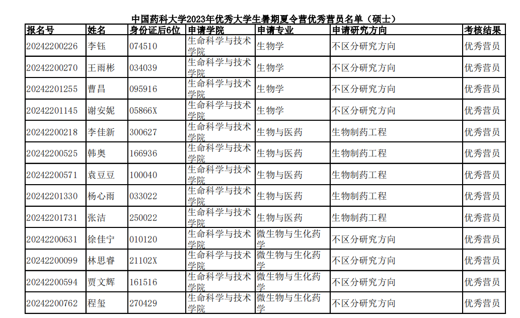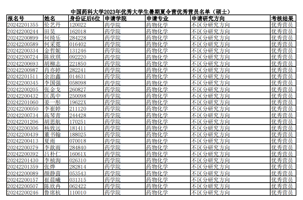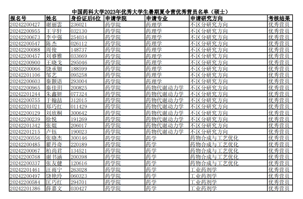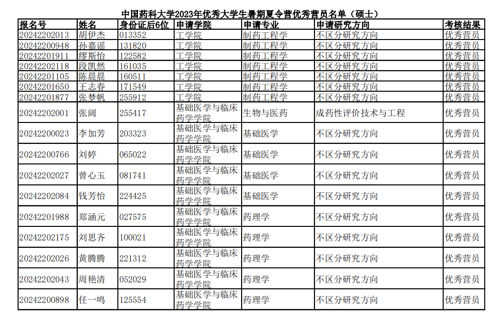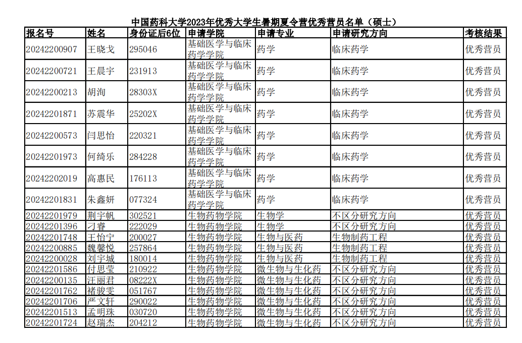 根据《中国药科大学 2023年优秀大学生夏令营暨 2024年推免生(含直博生)预选拔报名工作的通知》,各学院及学科专家组对所有全程参与的营员进行了考核,现将优秀营员名单予以公示,公示期为 2023年 7月 12日至 2023年 7月 25日( 10个工作日)。
