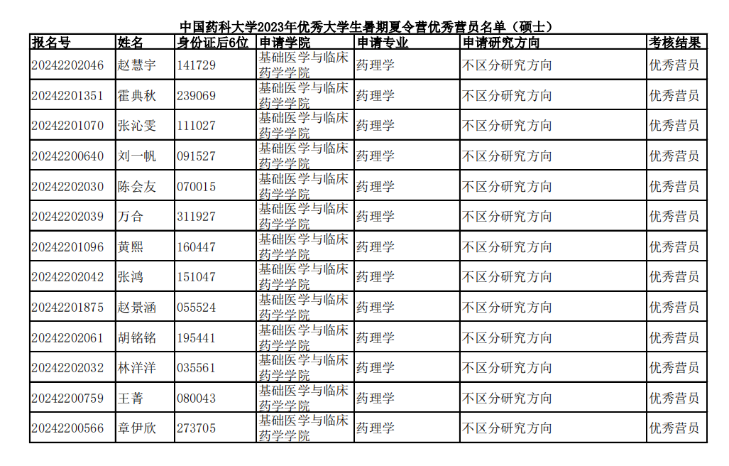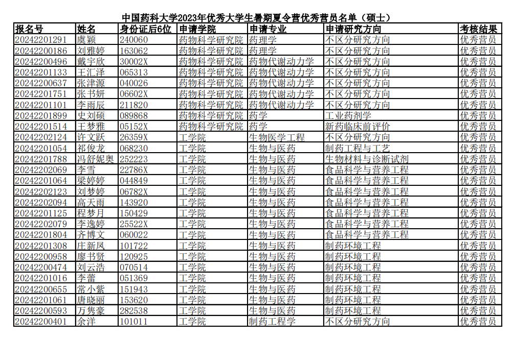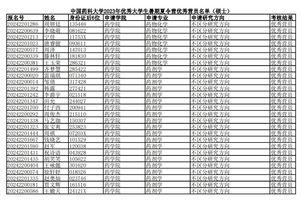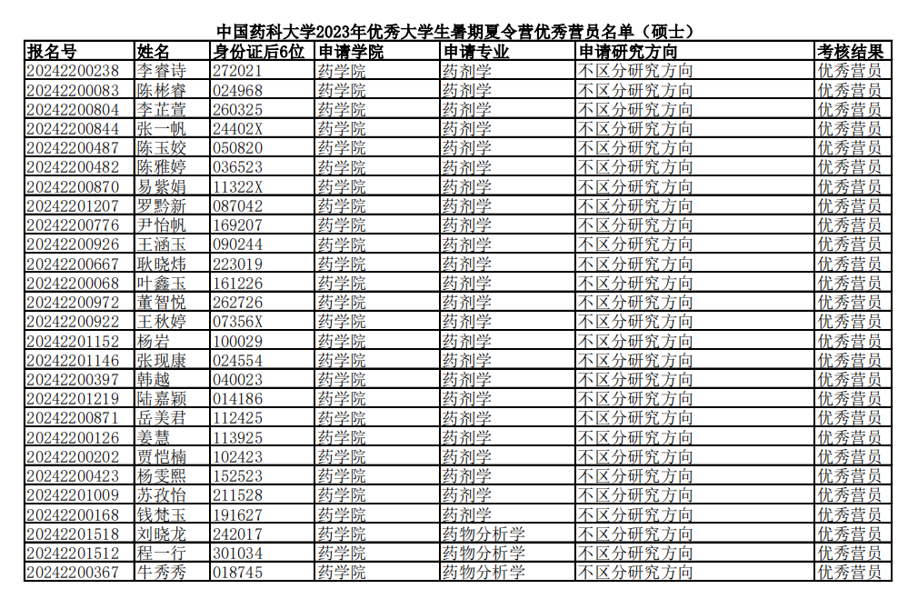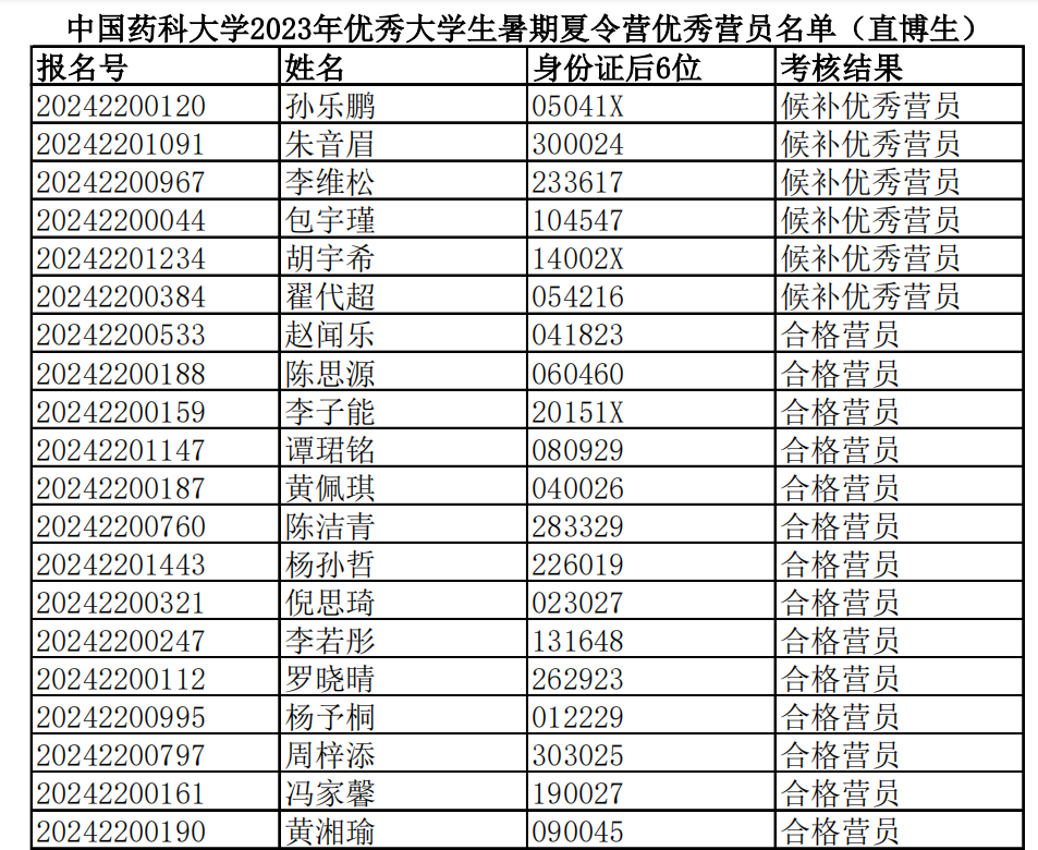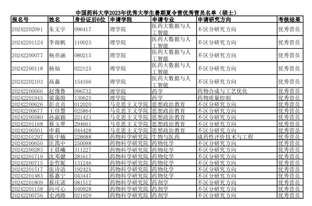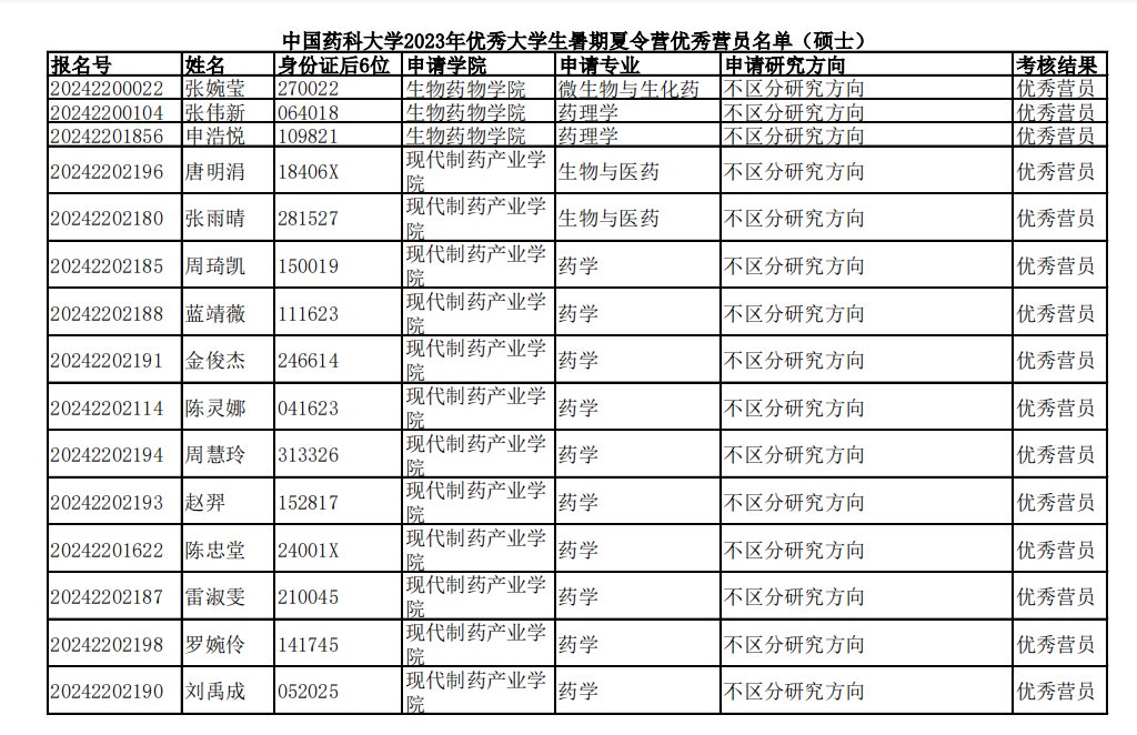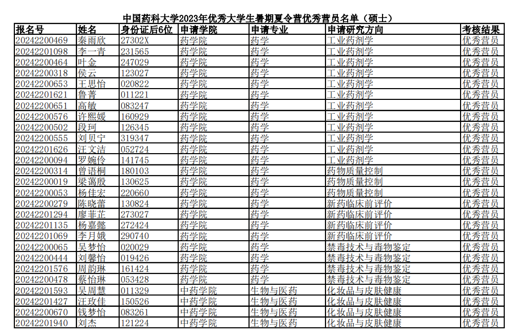 根据《中国药科大学 2023年优秀大学生夏令营暨 2024年推免生(含直博生)预选拔报名工作的通知》,各学院及学科专家组对所有全程参与的营员进行了考核,现将优秀营员名单予以公示,公示期为 2023年 7月 12日至 2023年 7月 25日( 10个工作日)。