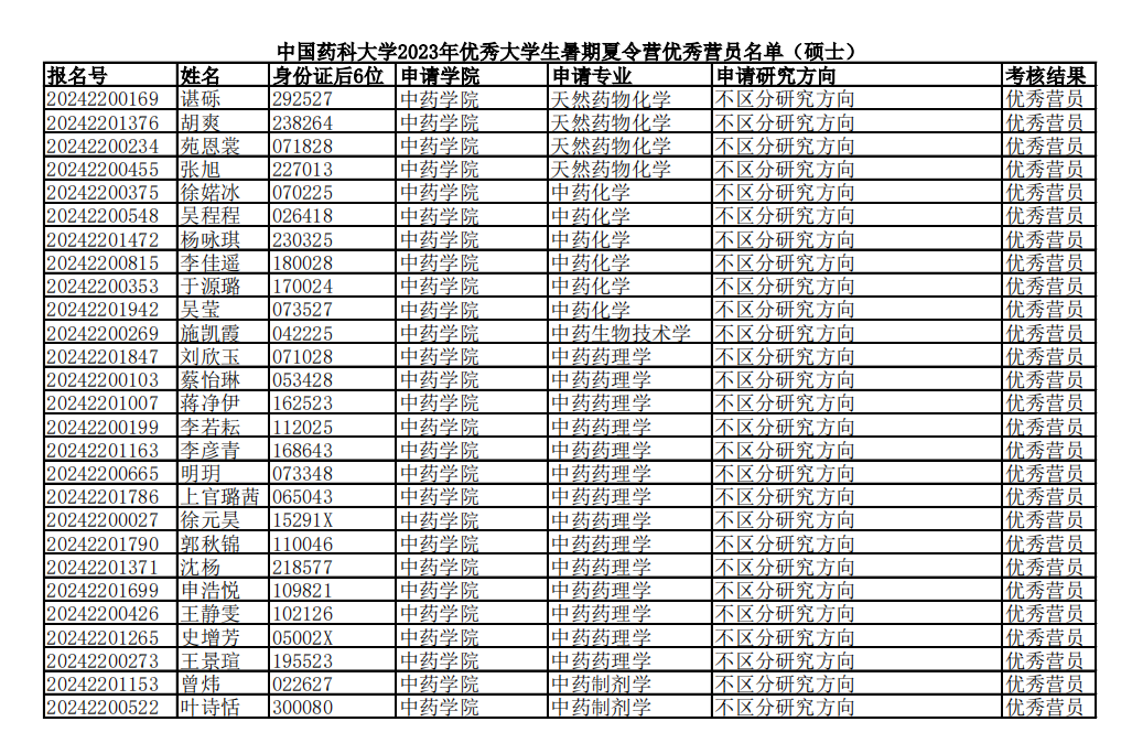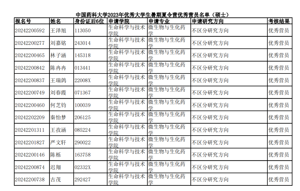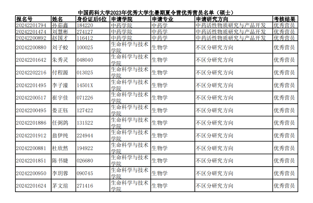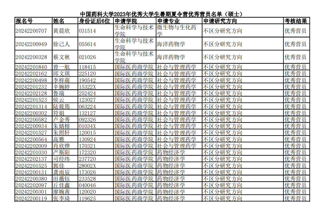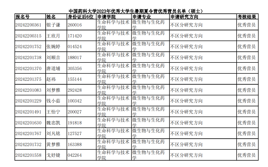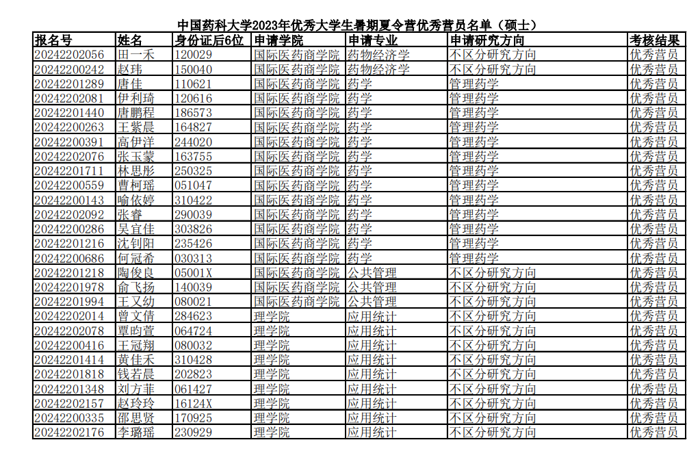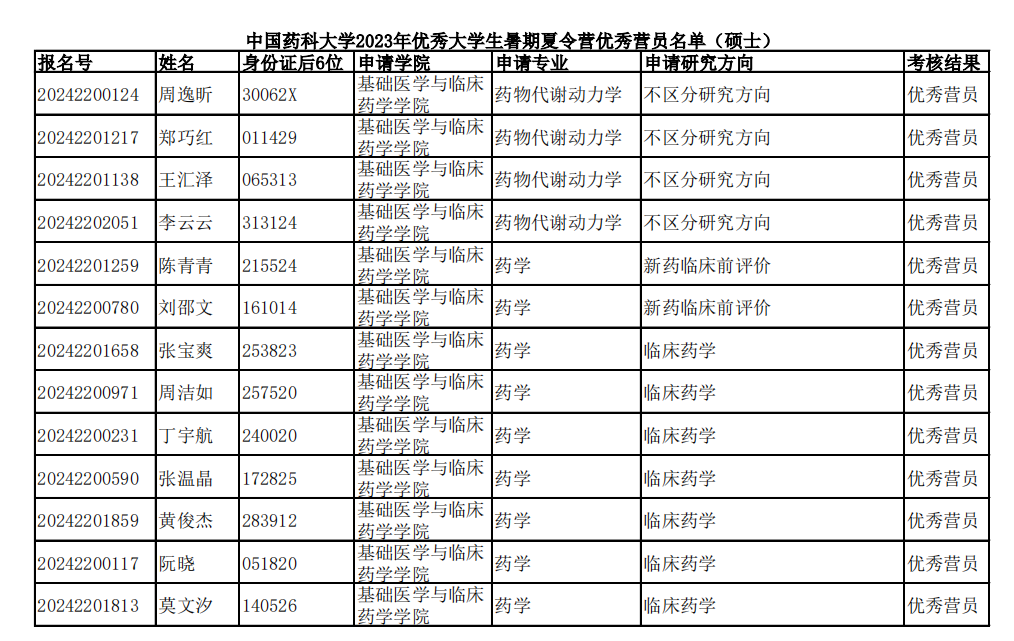 根据《中国药科大学 2023年优秀大学生夏令营暨 2024年推免生(含直博生)预选拔报名工作的通知》,各学院及学科专家组对所有全程参与的营员进行了考核,现将优秀营员名单予以公示,公示期为 2023年 7月 12日至 2023年 7月 25日( 10个工作日)。