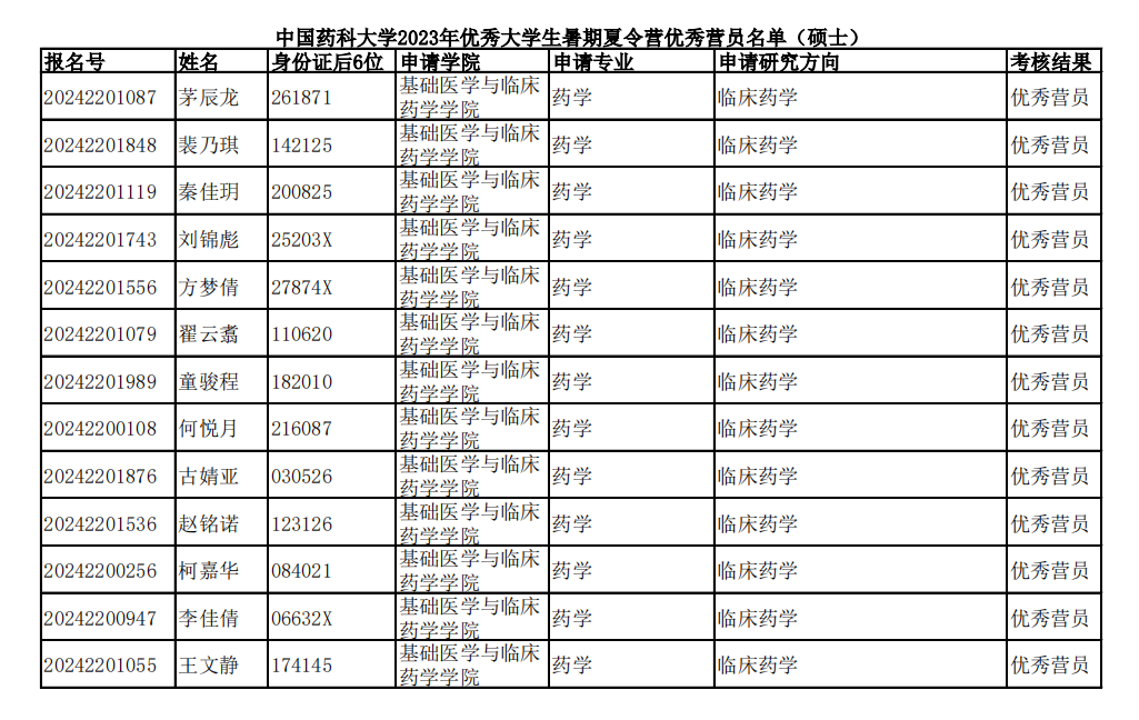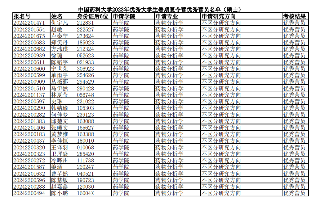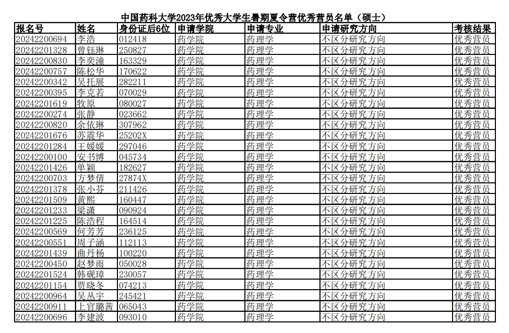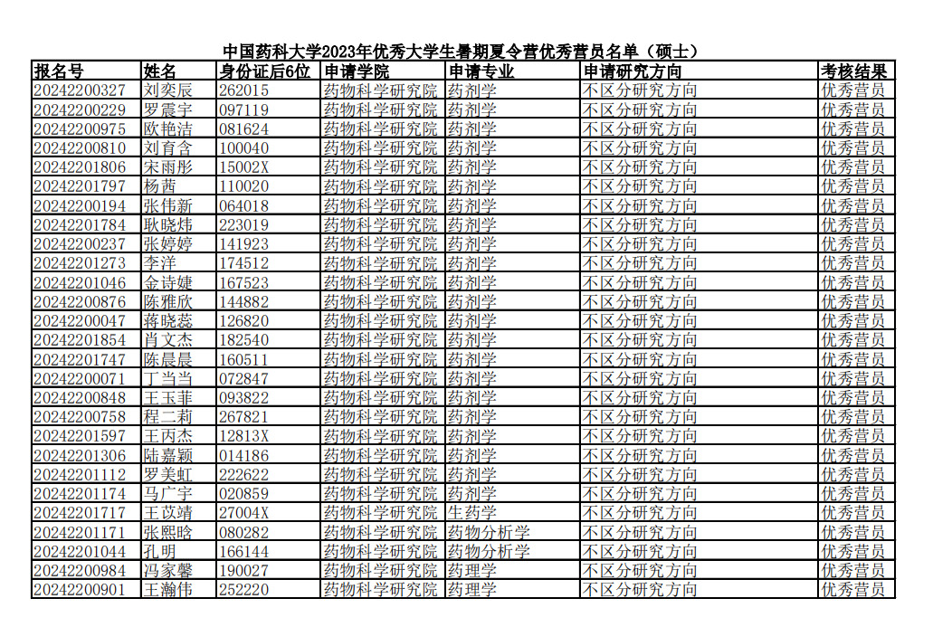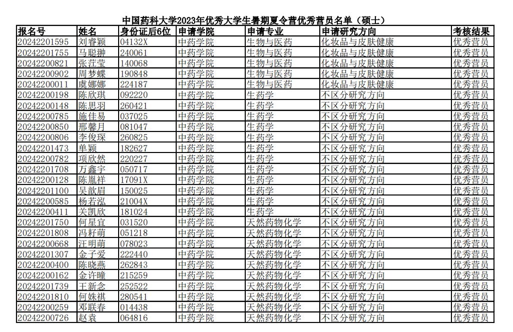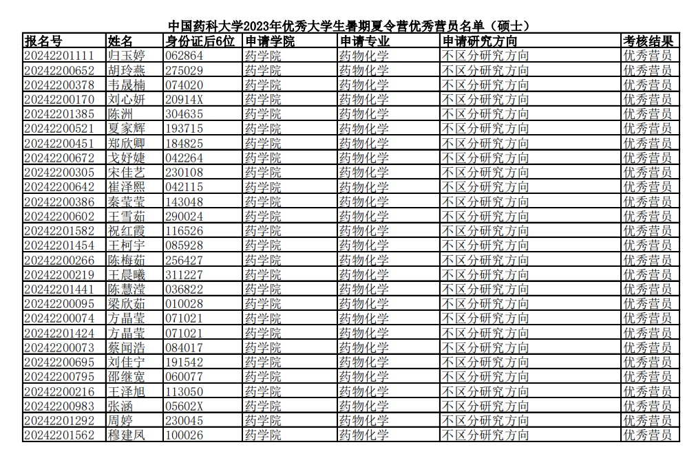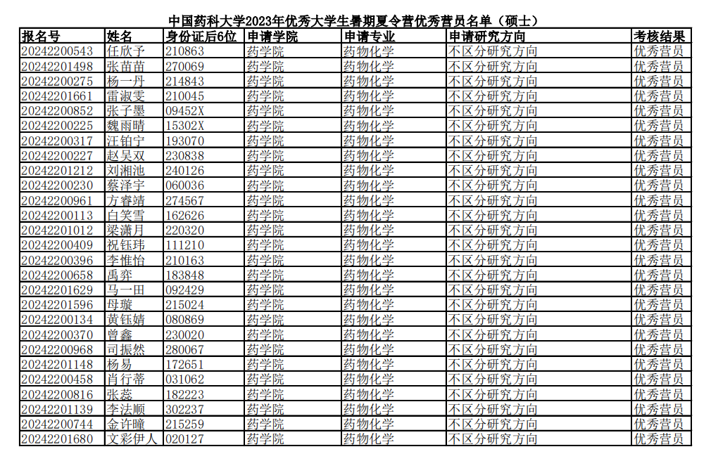 根据《中国药科大学 2023年优秀大学生夏令营暨 2024年推免生(含直博生)预选拔报名工作的通知》,各学院及学科专家组对所有全程参与的营员进行了考核,现将优秀营员名单予以公示,公示期为 2023年 7月 12日至 2023年 7月 25日( 10个工作日)。