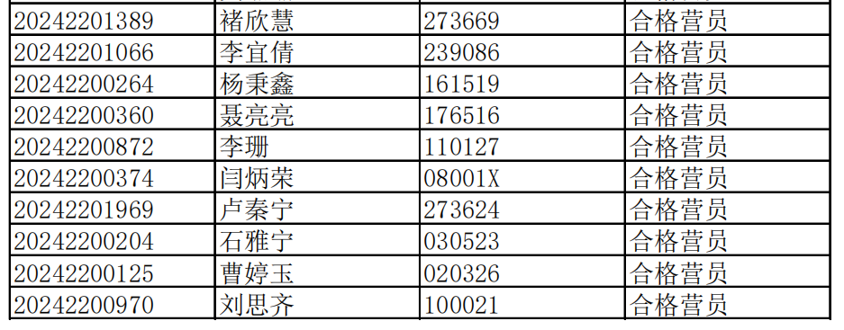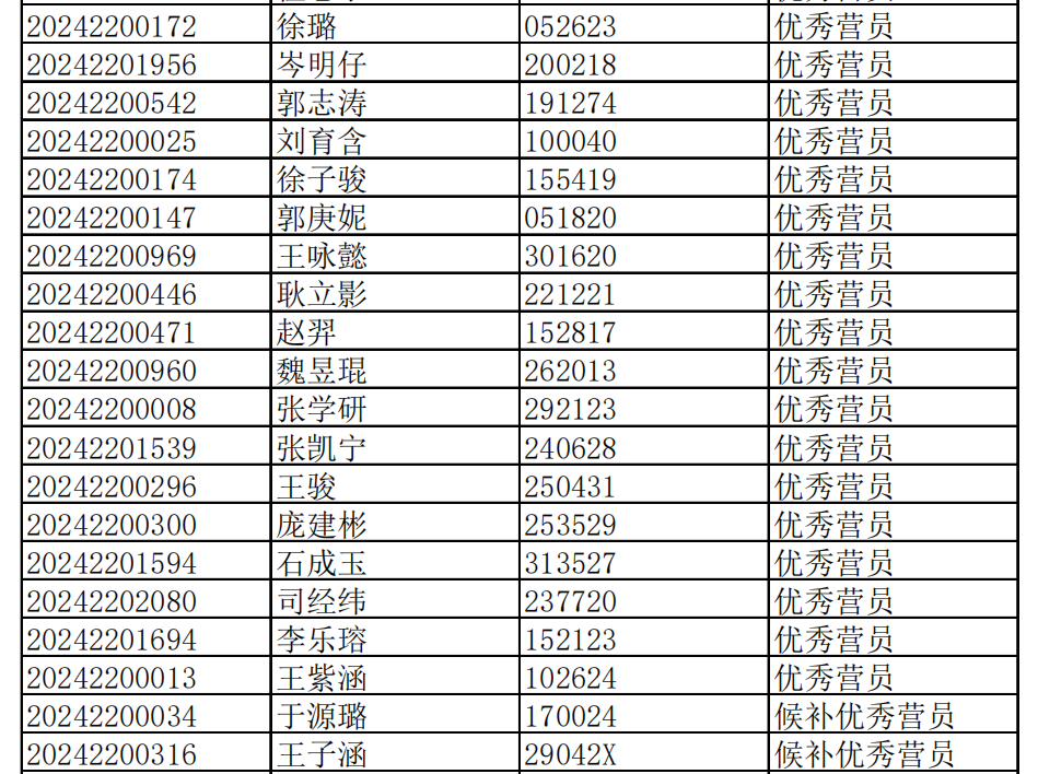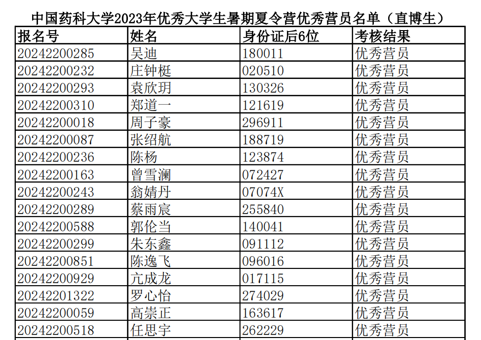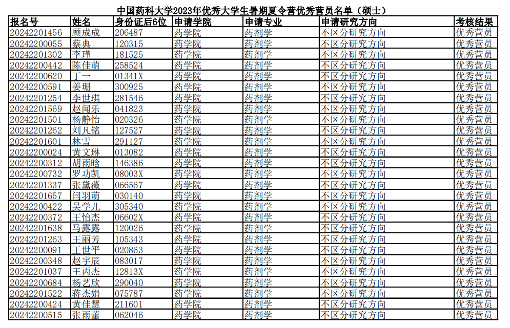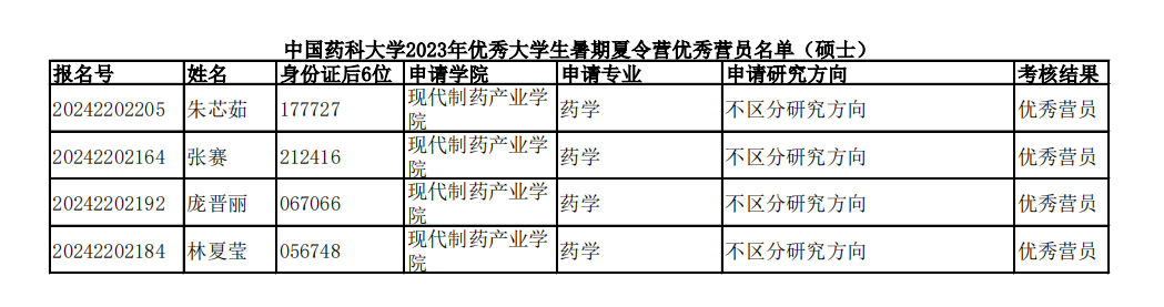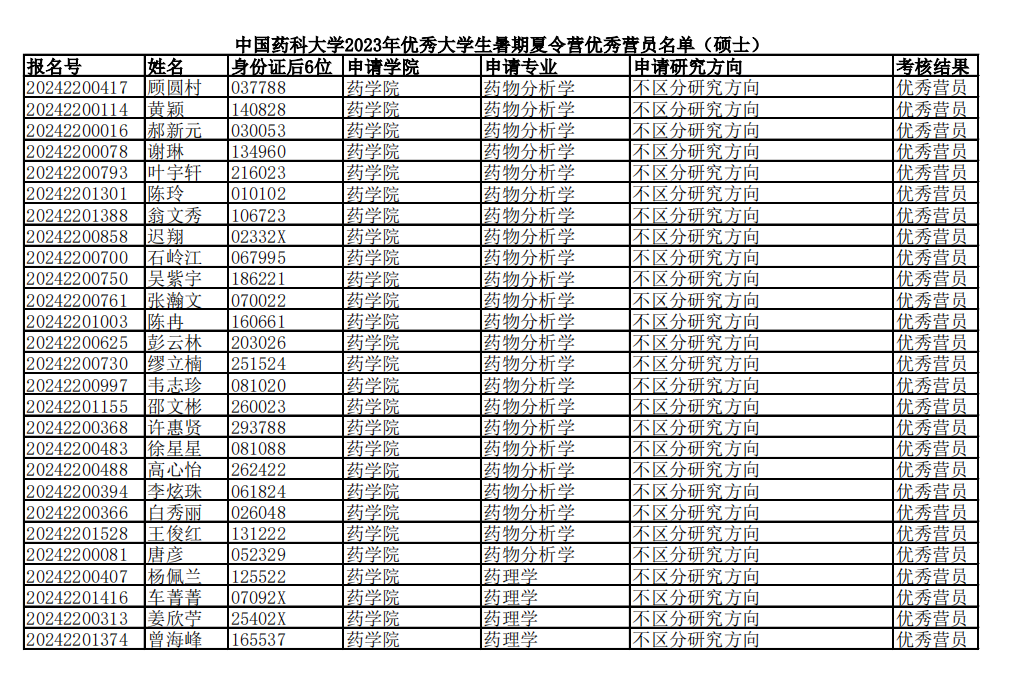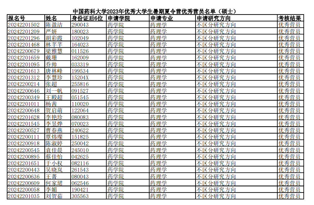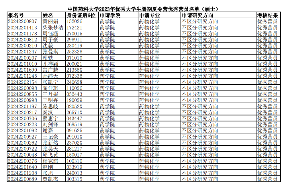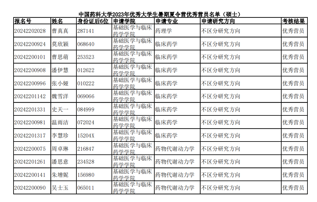 根据《中国药科大学 2023年优秀大学生夏令营暨 2024年推免生(含直博生)预选拔报名工作的通知》,各学院及学科专家组对所有全程参与的营员进行了考核,现将优秀营员名单予以公示,公示期为 2023年 7月 12日至 2023年 7月 25日( 10个工作日)。