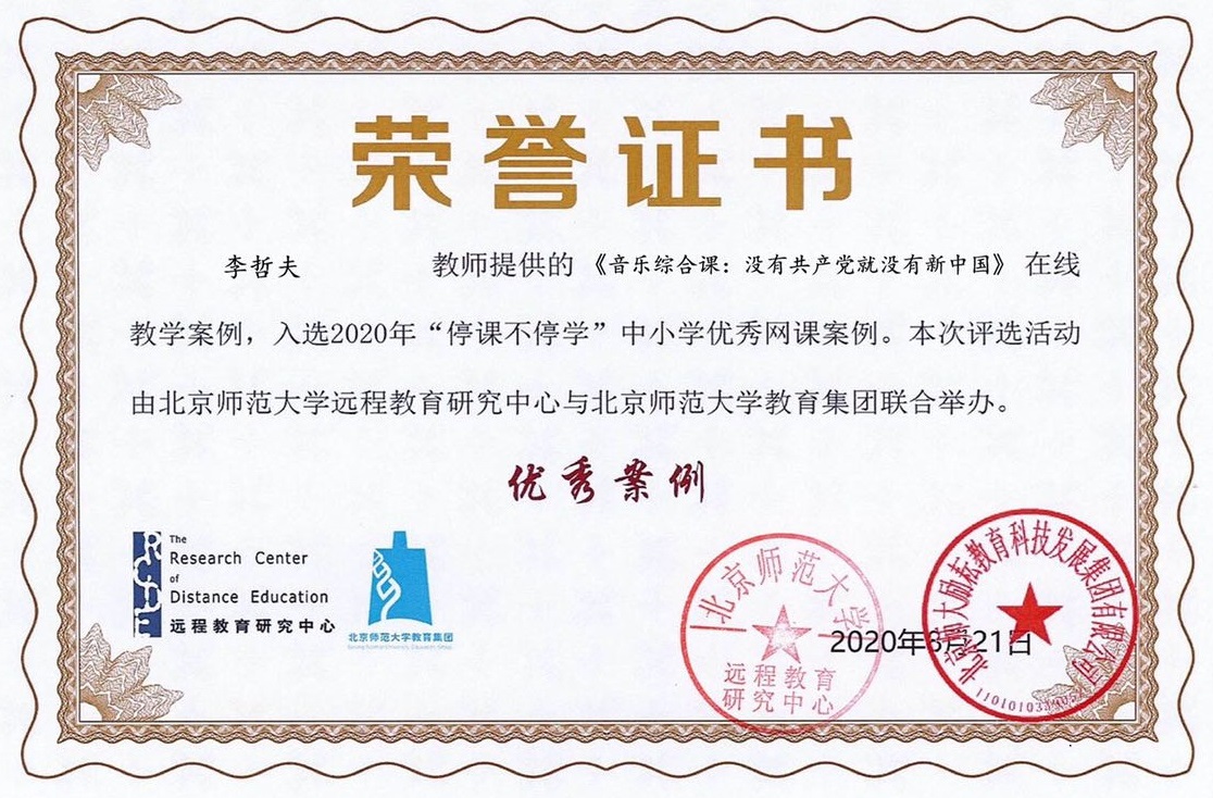 在刚刚揭晓的2020年“停课不停学”全国中小学优秀网课案例征集活动中,我校音乐学院研三音乐教育专业型硕士李哲夫(指导教师:高洁)的教学案例《音乐综合课:没有共产党就没有新中国》成功入选。