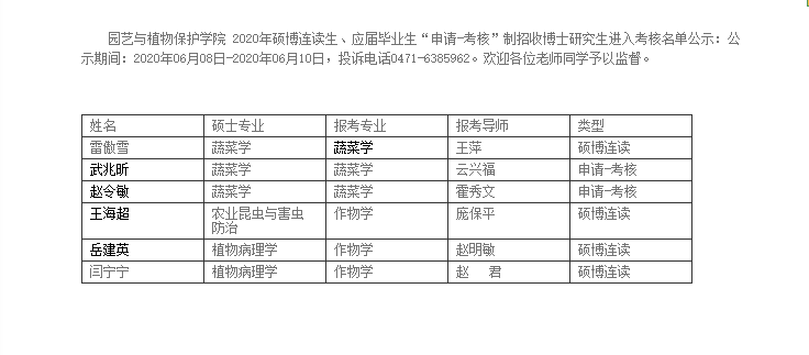 园艺与植物保护学院 2020年硕博连读生、应届毕业生“申请-考核”制招收博士研究生进入考核名单公示