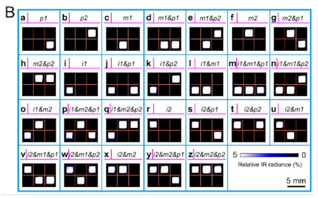 在将手集成到基于反射的防伪系统中进行信息识别的工作中,防伪标签由铝基底上喷涂透明的聚二甲基硅氧烷(PDMS)图案构成。金属铝对红外光具有很强的反射率而PDMS聚合物由于官能团的红外吸收导致反射率降低。当手作为红外光源放在防伪标签一侧时,防伪图案的不同部分反射的红外光强度不同,这种强度不同被红外相机捕捉并可视化,从而使得肉眼不可见的防伪图案被识别出来。通过调控PDMS薄膜的红外反射率,本研究进一步实现了多级彩色信息加密与识别,与单色的防伪图案相比,进一步提高了信息加密的等级与安全性(图2)。