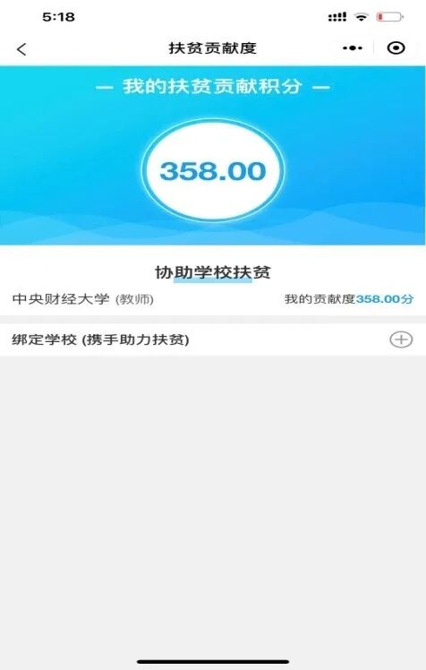 第四步:点击“我的”进入个人中心界面,点击“我的扶贫贡献度”,进入后点击“绑定学校(携手助力扶贫)”