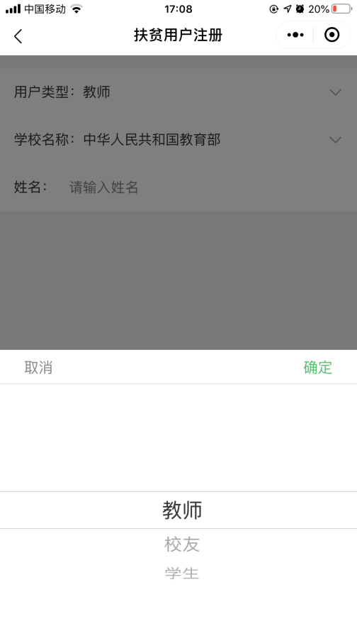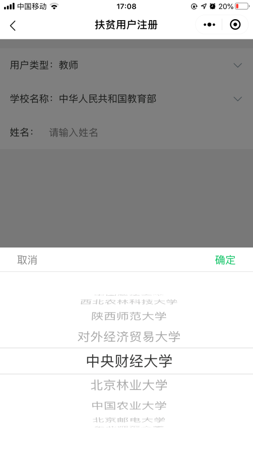 第五步:点击“用户类型”,根据自己实际身份选择;点击“学校名称”,选择中央财经大学;输入“姓名”后,点击“提交”,至此身份绑定完成。