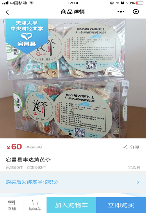 第八步:选择自己喜欢的商品,比如选择“宕昌县丰达黄芪茶”,点击“立即购买”后,并支付完毕;也可先加入购入车,等所有商品选购好之后,一起支付。