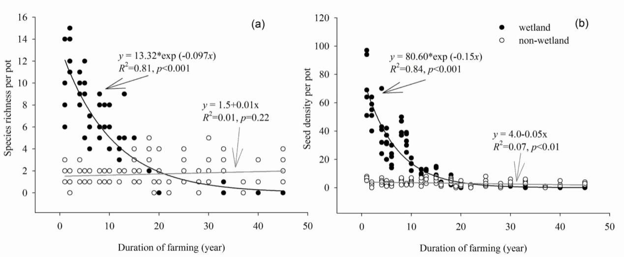 在沼泽湿地生态恢复理论研究方面,系统揭示了沼泽湿地土壤种子库的结构和规模特征,发现沼泽湿地土壤种子库具有非常高的物种多样性(>50种物种),在生态恢复中具有十分重要的作用。明确了水深和开垦年限是影响土壤种子库的关键限制性环境因素(Wang et al., 2015)。发现沼泽湿地开垦后,随着开垦年限的增加,土壤种子库结构和规模发生变化,湿地物种丰富度及种子密度呈现指数函数快速下降趋势,而非湿地物种维持在一个稳定的低水平。首次提出基于种源限制的沼泽湿地植被恢复的开垦年限阈值(15-20年),并结合植物功能群(莎草、禾草、非禾草、灌木)变化对退耕地植被自然恢复潜力进行“高—中—低”三级划分,为退化沼泽湿地植被恢复技术优化和物种选择提供科学依据(Wang et al., 2017)。目前该成果已被国内外多家著名的湿地生态恢复科研团队采用,作为制定流域尺度湿地生态恢复方案的关键参数。