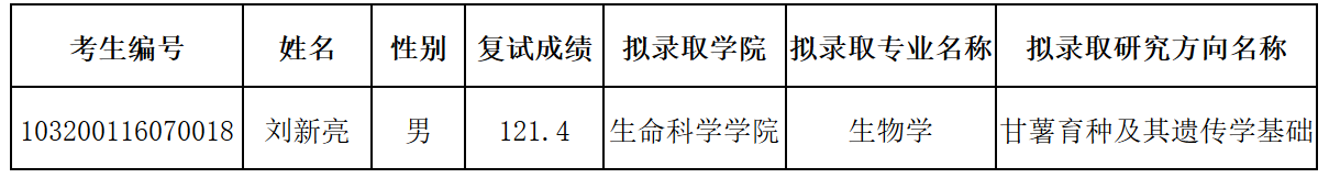 近期1名博士研究生考生(考生编号103200116070023,拟录取研究方向为甘薯育种及其遗传学基础),由于个人原因放弃我校2020年博士研究生拟录取资格。根据导师招生计划,经学院研招工作领导小组研究并报校研究生招生工作领导小组审定,按复试成绩递补1名考生进入拟录取名单。