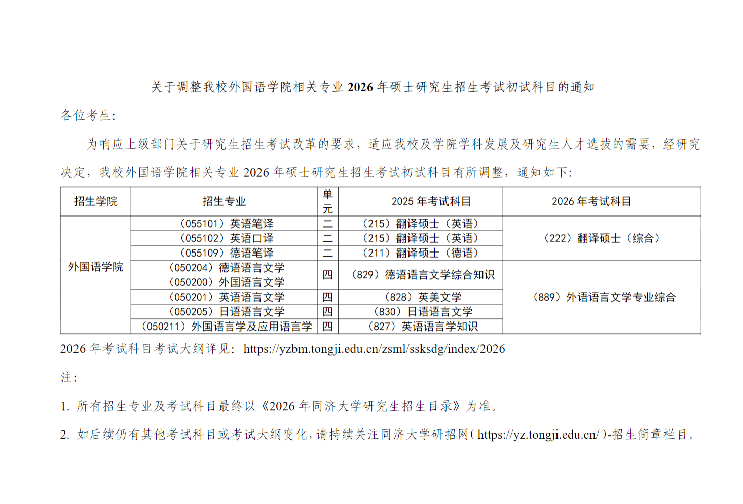 关于调整我校外国语学院相关专业2026年硕士研究生招生考试初试科目的通知