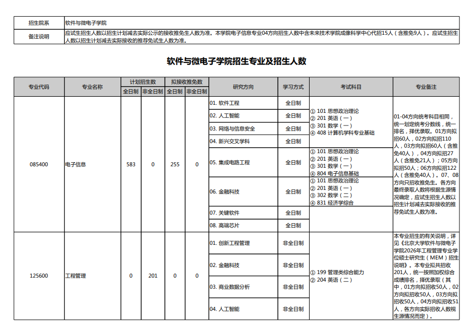 软件与微电子学院招生专业及招生人数