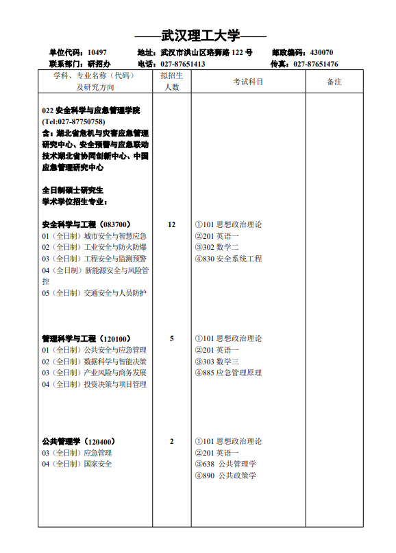 武汉理工大学2026年安全科学与应急管理学院硕士研究生招生目录