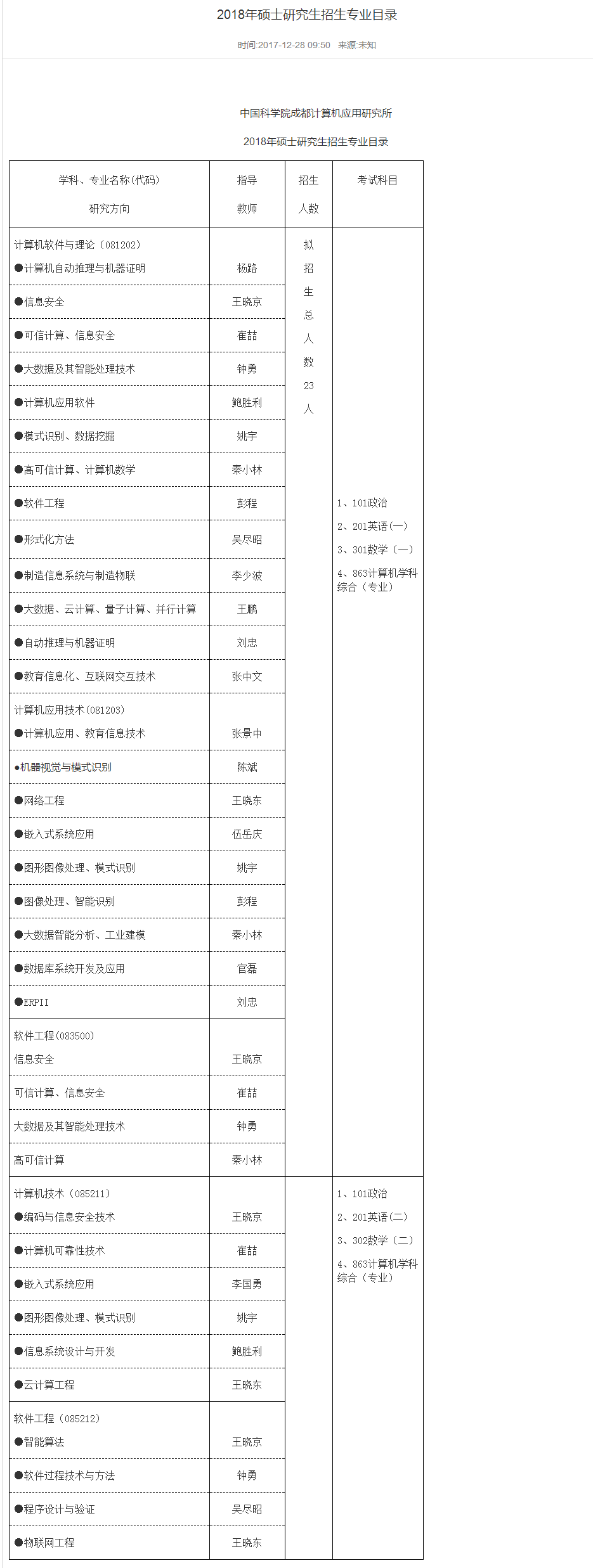 中国科学院大学成都计算机应用研究所2018年硕士研究生招生专业目录
