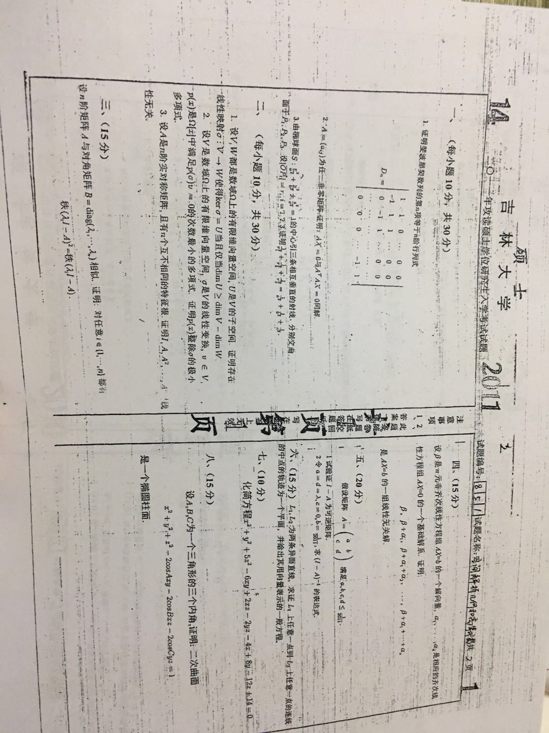 吉林大学 2011年 850空间解析几何与高等代数真题