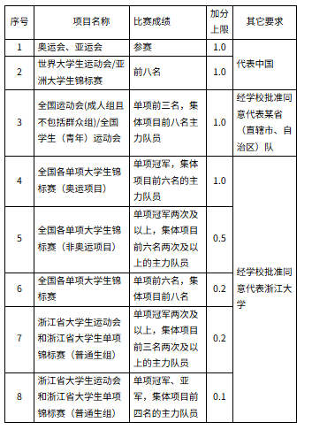 备注:应代表中国、浙江省(代表其他省/直辖市/自治区须经学校或学院同意)、浙江大学参赛;以上比赛项目均应为近两届全运会所设置的比赛项目,不包括群众项目;团体项目应为主力队员。