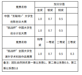学科竞赛素质评价加分依据《浙江大学本科生学科竞赛管理办法》(浙大本发[2021]20号)执行。在中国“互联网+”大学生创新创业大赛、“挑战杯”中国大学生创业计划大赛、“挑战杯”全国大学生课外学术科技作品竞赛(以下简称:“三大赛”)中,代表浙江大学参赛并获得三等奖(铜奖)及以上奖项且团队自然排名前三的加分分值,国赛按学校确定加分分值(附表)为准。省赛在国赛加分分值基础上乘以系数0.2。