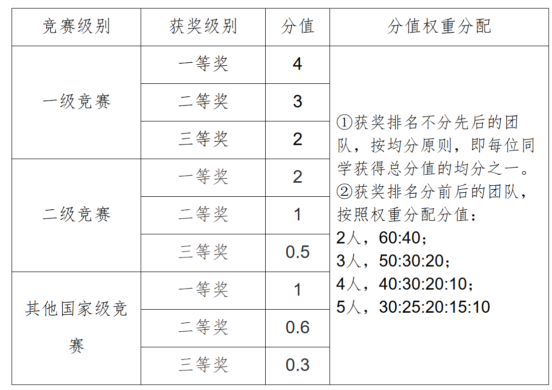 原则上仅限学生本科阶段作为唯一队员或主力队员(每支队伍主力队员不多于5人)参加与学业相关的国内权威学科竞赛(全国赛)并获得三等奖以上奖励(国际赛事参照执行,但不得低于国内赛事相关要求),最高加4分,多项赛事不累计加分。(具体见附件:《学科竞赛类加分指导意见》)。该项加分由创新创业教育中心认定并负责解释。