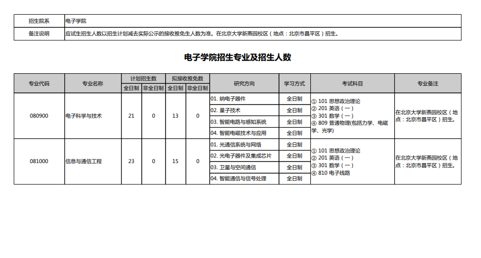 电子学院招生专业及招生人数
