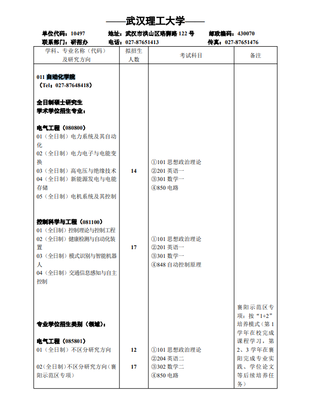 武汉理工大学2026年自动化学院硕士研究生招生目录