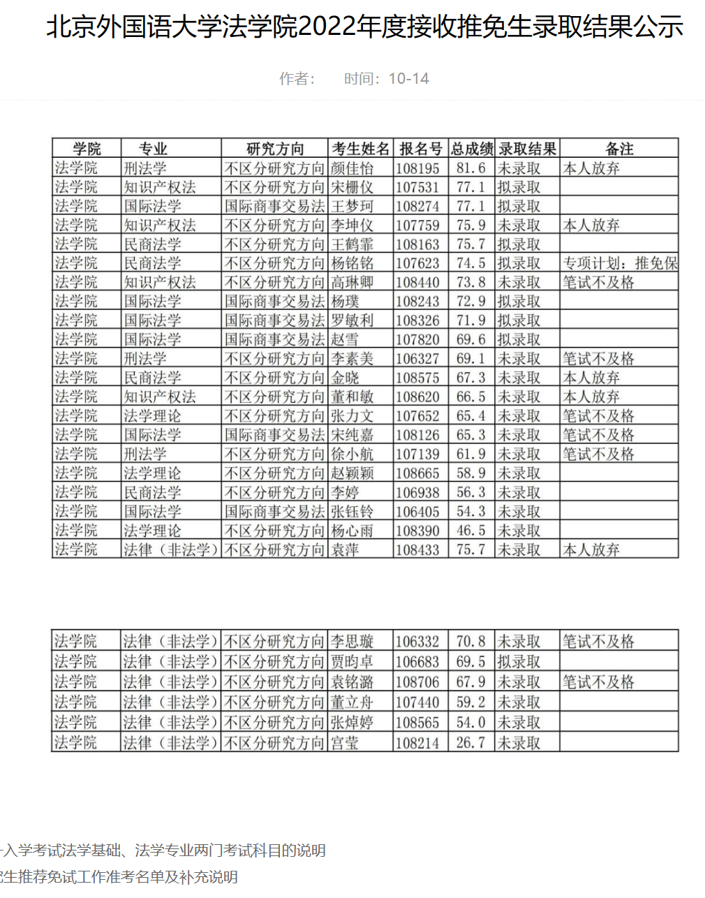 北京外国语大学法学院2022年度接收推免生录取结果公示