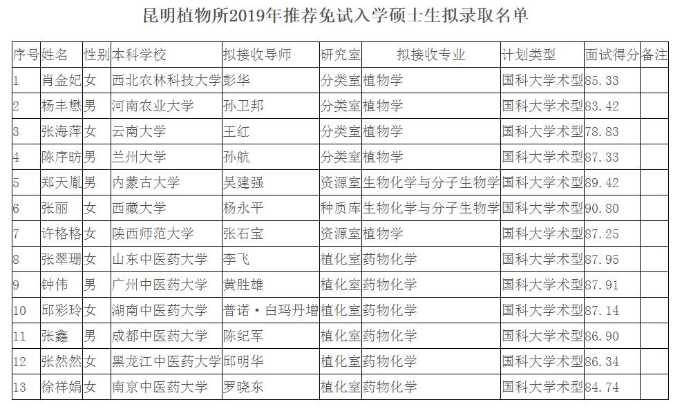 中科院昆明植物所2019推荐免试入学硕士生拟录取名单公示