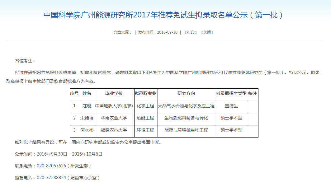 中国科学院大学广州能源研究所2017年推荐免试生拟录取名单公示(第一批)
